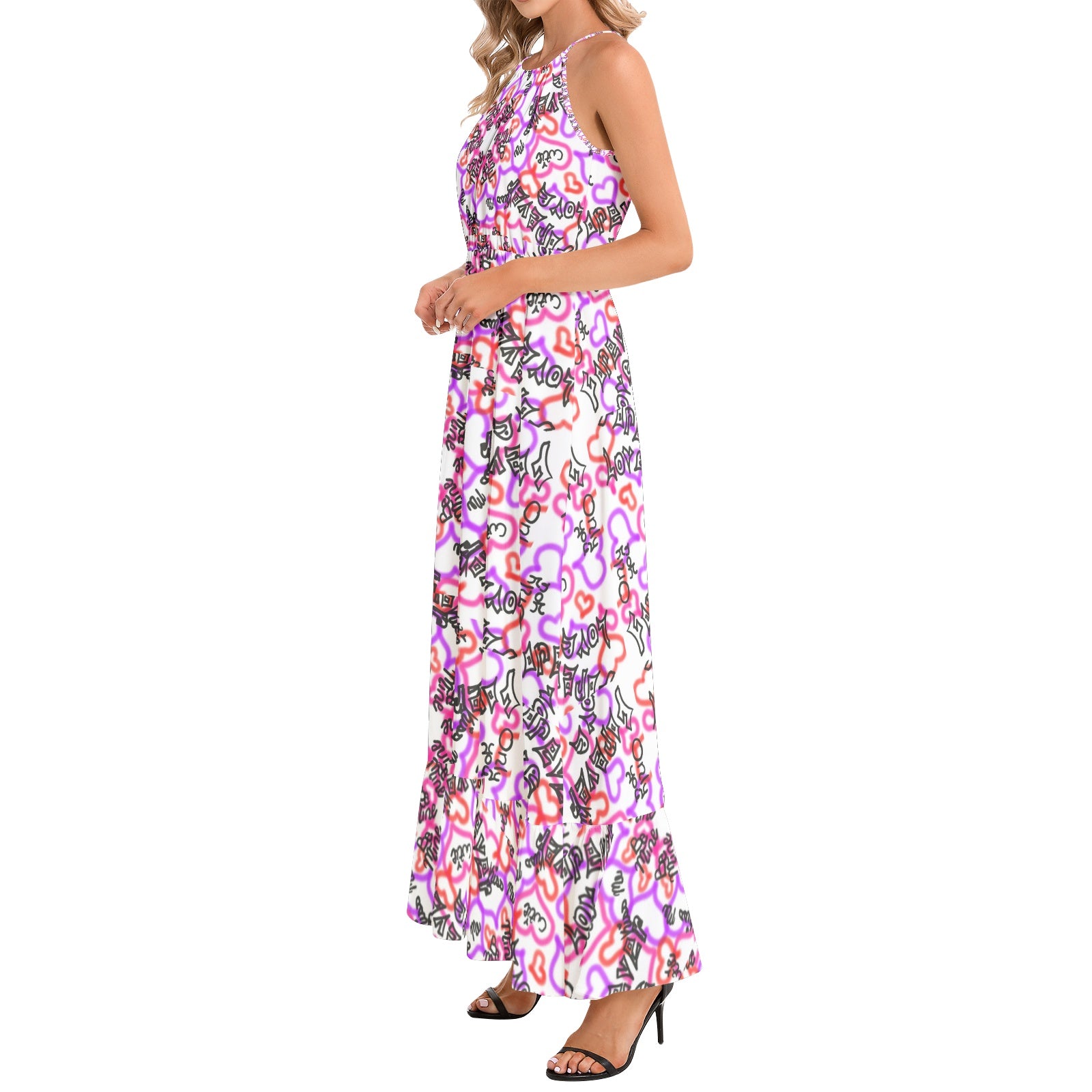 Sleeveless, Halter neck, Tie back, A-Line flared, Ruffle hem, Maxi Dress